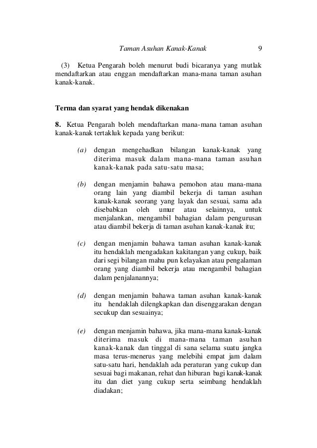 7304 akta taman asuhan kanak kanak 1984 pe r at u r a n pe r at u r a n ta m a n as u h a n ka n a k ka n a k 2012 pa d a menjalankan kuasa yang diberikan oleh seksyen 23 akta taman asuhan kanak kanak 1984 akta 308 menteri membuat peraturan peraturan yang berikut. Nisbah pengasuh dengan kanak kanak hendaklah mencukupi seperti jadual berikut. 2 2 2 taska komuniti ditafsirkan sebagai. Pengecualian bahagian ii pendaftaran taman asuhan kanak kanak 4.
