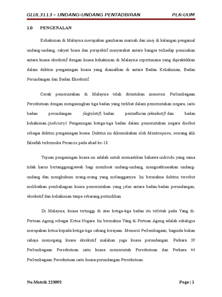 Kerajaan persekutuan menggunakan prinsip pemisahan kuasa di bawah artikel 127 perlembagaan persekutuan dan mempunyai tiga cabang. Menjadi pentadbir keadilan dalam kes kes sivil dan jenayah di malaysia 5. Sistem kehakiman di malaysia adalah sistem mahkamah dipersekutuakan dan beroperasi secara seragam di seluruh negara. Kuasa tertinggi di malaysia ialah.