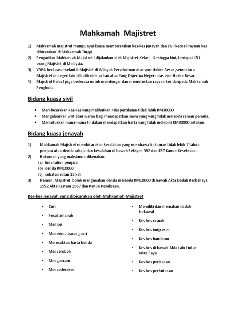 Mahkamah majistret kelas 1 berkuasa mengendalikan kes jenayah dan sivil termasuk kesalahan yang membawa hukuman mati tetapi tidak berkuasa untuk menjatuhkan mati. 2 5 mahkamah majistret terdapat dua jenis majistret iaitu majistert kelas i dan majistret kelas ii. Majistret kelas 1 bidang bicara. Mahkamah ini membicarakan kesalahan yang hukumannya tidak melebihi 10 tahun penjara atau denda mahkamah ini mempunyai kuasa untuk menyelenggarakan siasatan permulaan atas tuduhan tuduhan yang berat sebelum dibawa ke mahkamah tinggi.