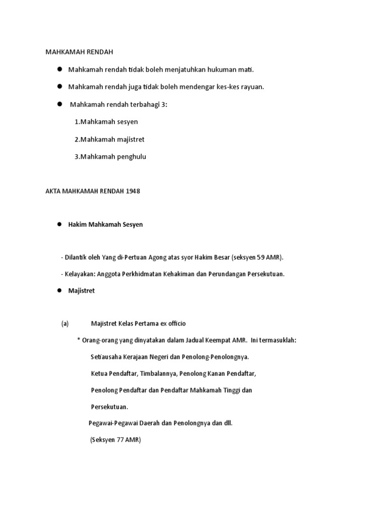 Sebuah mahkamah majistret dipengerusikan oleh suatu tribunal terdiri dari dua atau lebih kebanyakannya umum tiga jaksa keadilan atau oleh seorang hakim daerah bekasnya digelarkan seorang majistret dibayar gaji dan. Mahkamah majistret sivil kelas pertama majistret kelas pertama boleh mendengar kes sivil di mana jumlah tuntutannya tidak melebihi rm100 000 mahkamah majistret jenayah kelas pertama boleh mendengar kes jenayah di mana hukuman yang diperuntukan oleh undang undang ialah denda sahaja termasuk kesalahan trafik boleh mendengar kes jenayah di mana tempoh pemenjaraan yang ditetapkan. Mahkamah penghulu sistem mahkamah paling rendah. Mahkamah majistret mempunyai bidang kuasa.