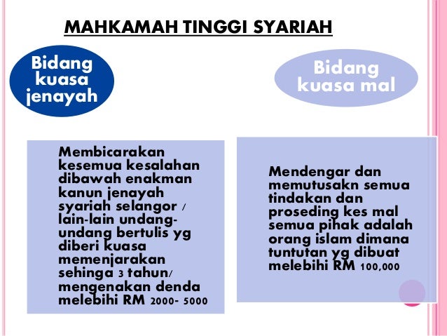Bidang kuasa mahkamah syariah adalah sebagaimana yang diperuntukkan oleh perlembagaan malaysia. Pindaan perkara 121 1a perlembagaan persekutuan pada 1988 memberi mahkamah syariah bidang kuasa berasingan daripada mahkamah sivil menjadikan mahkamah syariah bebas daripada campur tangan mahkamah biasa dan dianggap setaraf. Enakmen enakmen negeri di malaysia telah menentukan perkara perkara berikut menjadi bidang kuasa mahkamah syariah sepenuhnya iaitu 1. Perkara perkara mal sivil mahkamah syariah a pertunangan nikah cerai membatalkan nikah atau perceraian atau pembubaran nikah kehakiman.