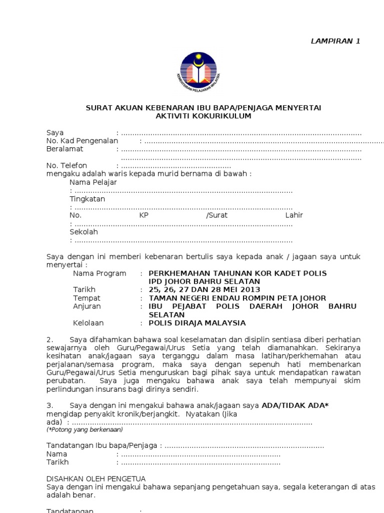Borang kebenaran ibu bapa kpm. Dengan ini memberi pengakuan bahawa saya membenarkan anak saya anak jagaan saya seperti nama. Bekerjasama dengan ibu bapa komuniti dan sector swasta secara meluas. Dengan ini saya memohon kebenaran untuk menggunakan kenderaan saya sendiri dalam menjalankan tugas rasmi ke tempat tempat berikut dan menuntut elaun hitungan kilometer kelas a. Portal rasmi kementerian pendidikan malaysia.
