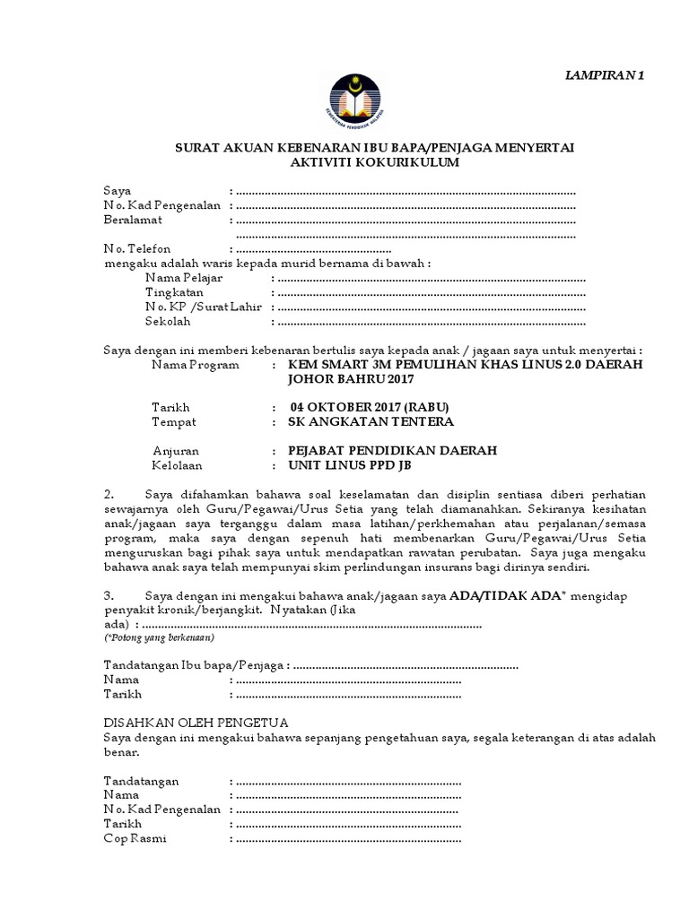 Borang kebenaran ibu bapa menyertai aktiviti kokurikulum kpm. Surat akuan kebenaran ibu bapa penjaga menyertai aktiviti kokurikulum luar saya nama. Penganugerahan doktor muda oleh kpm. Kp surat lahir. Tandatangan ibu bapa penjaga waris pengakuan saksi.