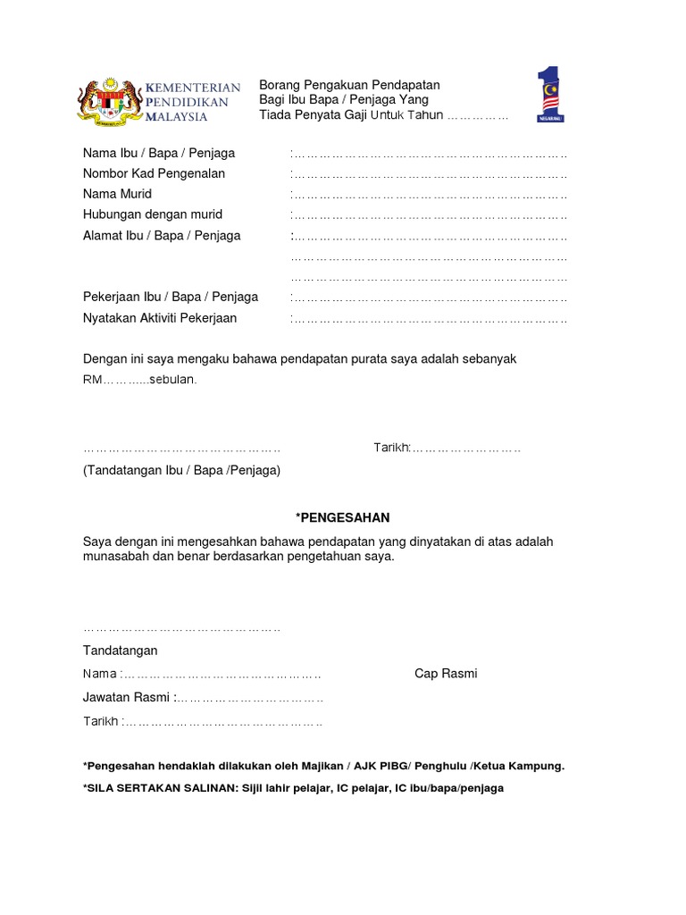 Bagi negeri kelantan ialah penggawa pemanca ketua kampung dan yang setaraf dengannya berdasarkan pengakuan pendapatan yang disertakan bersama. Borang pengesahan pendapatan bagi ibu bapa penjaga yang tiada penyata gaji bekerja sendiri diisi oleh ibu bapa penjaga kepada. Borang pengesahan pendapatan bagi ibu bapa penjaga yang tiada penyata gaji bekerja sendiri diisi oleh ibu bapa penjaga kepada. Bagi ibu bapa penjaga yang tiada penyata gaji tiada pendapatan untuk tahun.