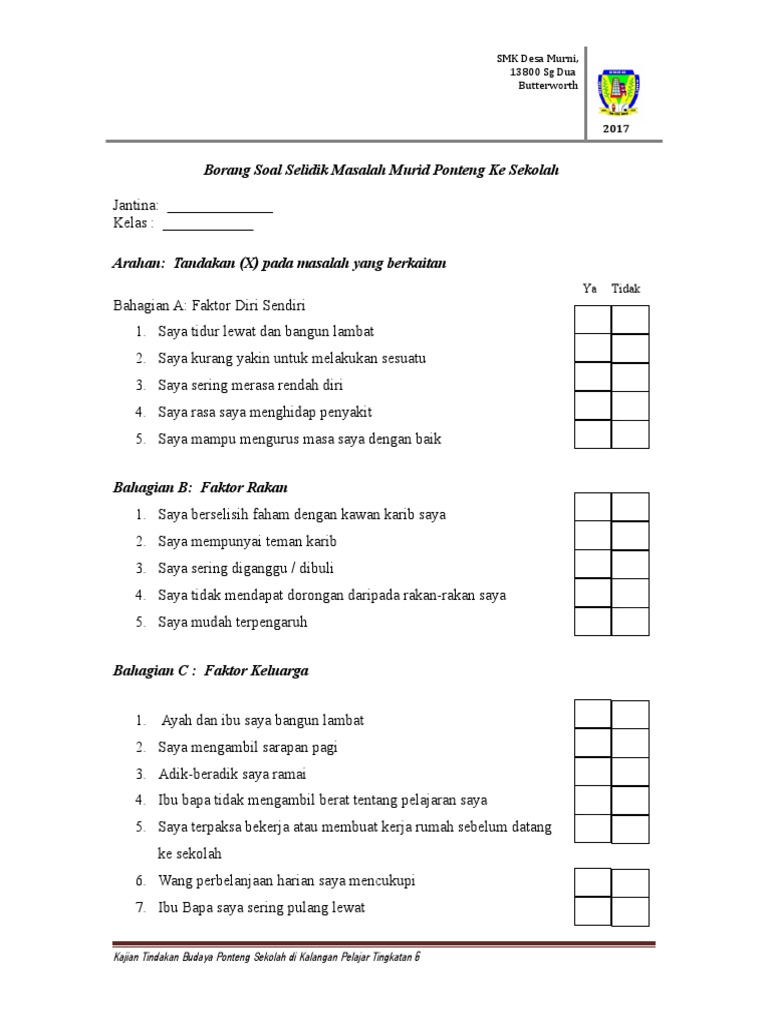 Related posts to contoh borang soal selidik gejala ponteng sekolah 15 contoh borang soal selidik gejala ponteng sekolah 15 2016 11 01t17 19 00 07 00 rating. Soalan latihan matematik tahun 2 pdf. Adakah anda bersarapan dahulu sebelum ke sekolah. Related posts to contoh soalan soal selidik ponteng sekolah contoh soalan soal selidik ponteng sekolah 2019 11 07t20 00 00 08 00 rating.