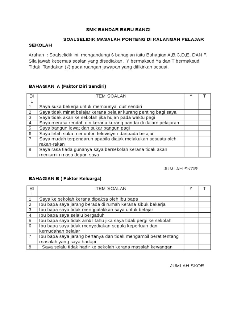 Borang soal selidik ponteng sekolah. Borang soal selidik kajian kes ponteng dalam kalangan pelajar sekolah. Related posts to contoh soalan kaji selidik ponteng sekolah contoh soalan kaji selidik ponteng sekolah 2019 11 22t05 01 00 08 00 rating. Bagaimanakah anda bangun tidur pada setiap pagi sebelum ke sekolah. Borang soal selidik pengurusan ponteng sekolah dan pengaruhnya terhadap masalah ponteng dalam kalangan pelajar sekolah rendah di daerah kota belud.