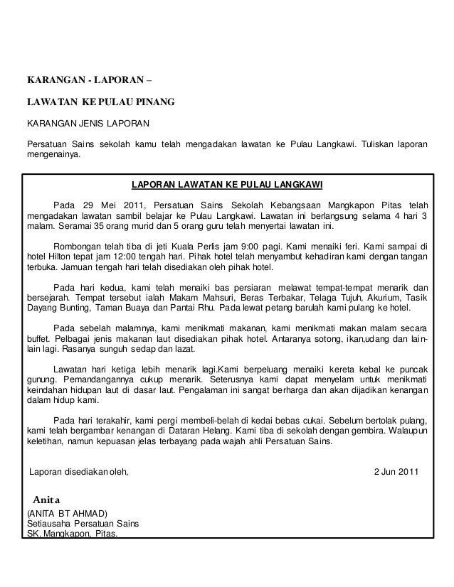 Format karangan jenis laporan karangan jenis ini menghendaki anda melaporkan sesuatu peristiwa yang didengar atau dilihat. Karangan jenis laporan bertujuan untuk melaporkan sesuatu hal atau peristiwa yang telah berlaku. Laporan karangan jenis ini menghendaki anda melaporkan sesuatu peristiwa yang didengar atau dilihat. Unknown 13 september 2020 at 07 24.