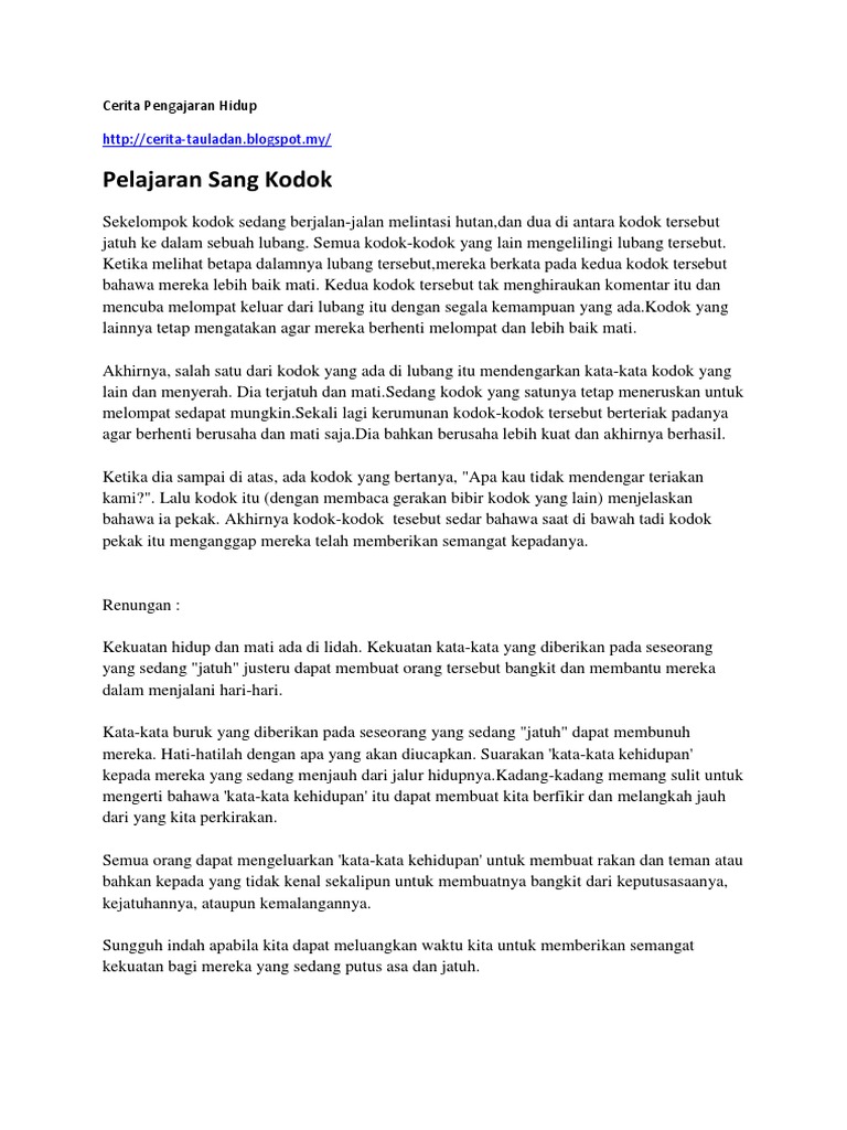 Cerita teladan dan pengajaran. Kerbau itu berjalan melalui satu lorong menuju ke sungai. Cerita pendek cerita pendek pendidikan cerita pendek fantasi teks cerita pendek cerita pendek anak cerita pendek seram cerita pendek islami cerita pendek bermakna cerita pendek mandarin karangan cerita pendek kumpulan cerita pendek. Kisah dan pengajaran kisah teladan dan ajaran islam kisah teladan nabi sulaiman kisah teladan islam kisah kisah teladan kisah teladan rasulullah kisah teladan nabi muhammad kisah teladan umar bin khattab kisah teladan berbakti kepada orang tua kisah teladan pendek kisah teladan nabi kisah teladan ashabul kahfi. Bercerita dengan menggunakan sebutan intonasi dan gaya penyampaian yang sesuai.