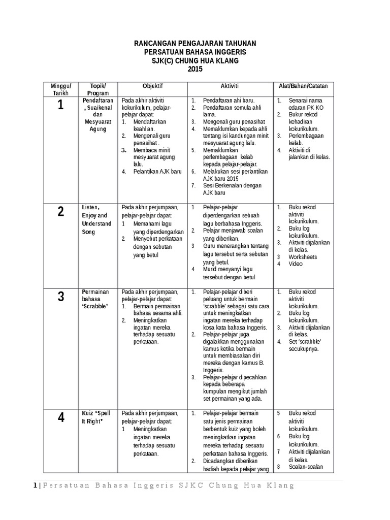 Daily news recap masa yang sesuai seperti masa rehat perlu dikhaskan untuk memberi peluang kepada pelajar mengimbas semula berita berita penting yang dilaporkan dalam bahasa inggeris sama ada dalam suratkhabar atau media media lain. Aktiviti kelab pencinta alam. Berikut merupakan contoh rancangan aktiviti tahunan. In sha allah berguna kepada rakan guru.