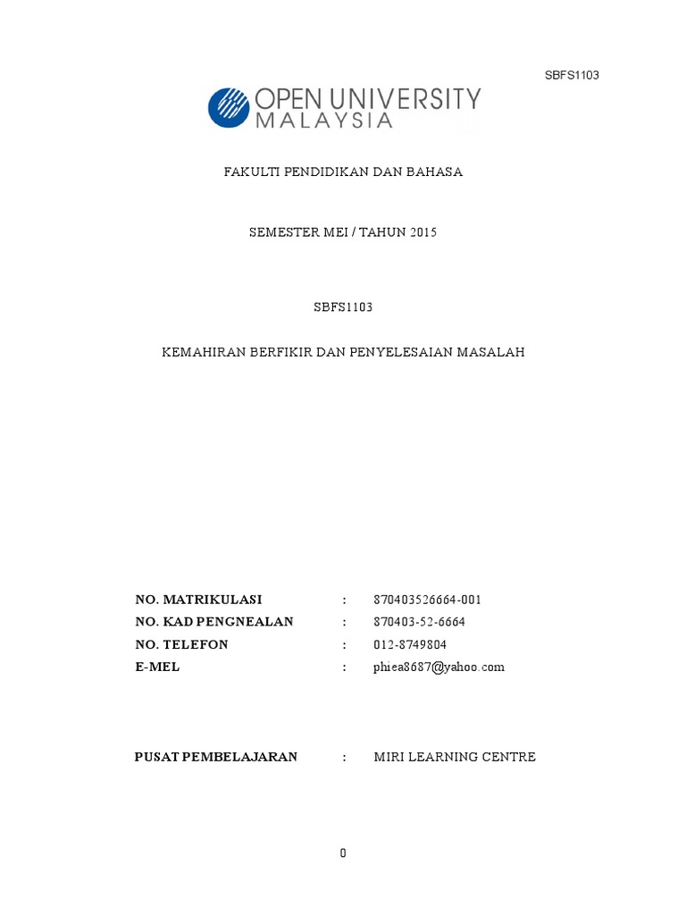 Assignment year 4 semester 1 january kemahiran berfikir dan penyelesaian masalah sbfs1103 1 pengenalan dewasa ini kita tidak terlepas dari bercakap tentang gst dan secara tidak langsung menjadi topik perbualan yang hangat diperkatakan disetiap peringkat tetapi ramai yang tidak mengetahui apa maksud sebenar gst. Masalah yang dikemukakan hendaklah berkaitan dengan matapelajaran. 001 hasil pembelajaran. Seseorang yang memperolehi kemahiran berfikir sanggup dan cekap dalam menyusun maklumat konsep atau idea secara yang teratur dan membuat kesimpulan atau keputusan yang tepat untuk tindakan yang terarah dan sewajarnya.