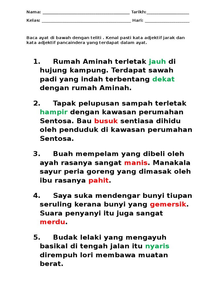 Contoh ayat kata adjektif pancaindera tahun 3. Kesemua ahli pasukan itu. Dan atau tetapi serta. Dia berdiri hampir dengan kereta saya. Kata adjektif sifatan atau keadaan terdiri daripada perkataan yang memberi pengertian sifatan atau keadaan sebagai unsur keterangan nama.