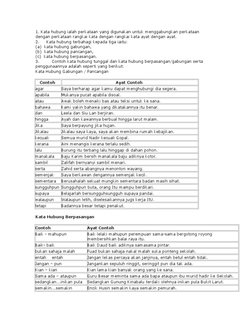 Kata hubung syarat atau kondisional adalah jenis kata hubung yang menerangkan bahwa kejadian tersebut dapat terjadi apabila syarat syaratnya terpenuhi. Menggabungkan dua ayat azhar dan malek pergi ke pulau pinag. Contoh contoh lain ayat kata hubung pancangan. Percantuman ayat ayat tunggal itu dibuat dengan cara tertentu antaranya dengan menggunakan kata hubung kata fakta bahawa kata relatif yang tanda koma dan tambahan keterangan.