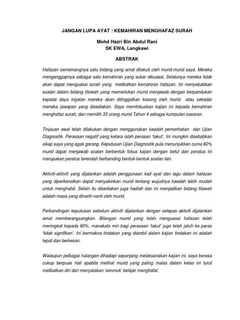 Contoh kajian tindakan pendidikan islam. Sebagai contoh kajian tindakan yang dilakukan di dalam pendidikan ialah untuk mengenalpasti pelajar yang lemah dalam mata pelajaran pendidikan islam para guru perlu mengenalpastinya dengan mengumpul markah dalam sesuatu ujian yang diperolehi dan mencari sebab munasabab daripada kegagalan pelajar dalam menjawab soalan yang diberikan samaada aras soalan tersebut terlalu tinggi kelemahan. Kemahiran menghafaz surah mohd hazri bin abdul rani sk ewa langkawi abstrak hafazan sememangnya satu bidang yang amat ditakuti oleh murid murid saya. Academia edu is a platform for academics to share research papers. Jangan lupa ayat.