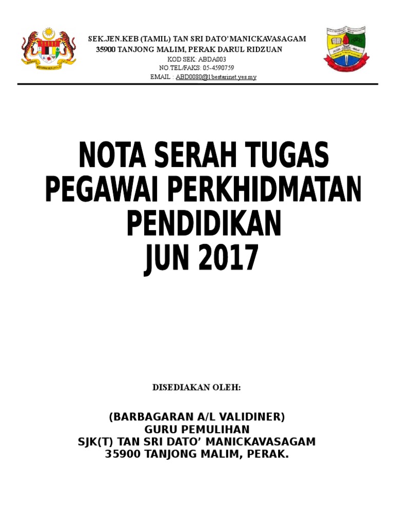 Menjadi penyelaras program program yang dianjurkan oleh unit bimbingan dan kaunseling jabatan pelajaran negeri. 193 6 3 4 20 bertarikh 19 julai 1985. Ini tidak lupa kepada staf dan karyawan para guru dan khususnya siswa siswi mts yaketunis dan guru bimbingan dan konseling ibu siti sa adah s pd yang telah membantu dalam pengumpulan data yang penulis butuhkan. Garis panduan penyediaan nota serah tugas ini disediakan bagi memberi panduan untuk membantu pihak pengurusan dan agensi agensi dibawah termasuk pejabat pelajaran daerah dan sekolah sekolah menyediakan nota serah tugas yang seragam dan sesuai mengikut format yang digunakan oleh semua kementerian dan jabatan kerajaan.