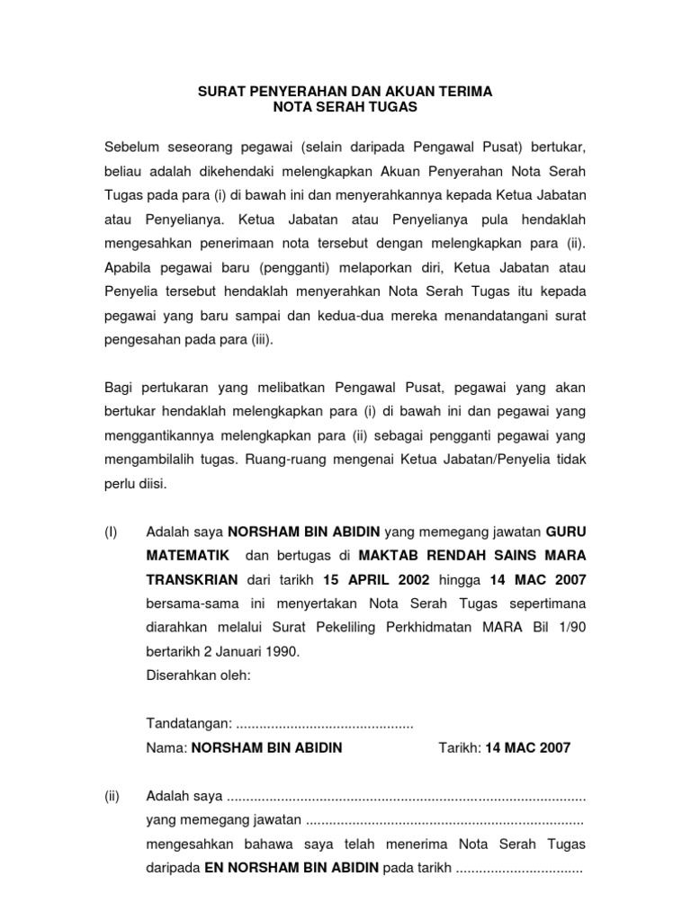 Ayah dan ibu tercinta bapak gunawan dan ibu kusmiyati yang tiada. Sebelum mengakhiri perkhidmatan di stesen lama nota serah tugas merupakan satu dokumen yang sangat penting untuk disediakan dan perlu diserahkan kepada sekolah terdahulu sebelum mula berkhidmat di sekolah baru. 11 adalah saya md khirom bin ab. Rahman yang memegang jawatan guru besar di sekolah kebangsaan seri separap batu pahat johor dari tarikh 16 november 2007 bersama ini menyerahkan nota serah tugas sepertimana diarahkan oleh jabatan perkhidmatan awam melalui surat bilangan jpa 193 6 3 4 20 bertarikh 19 julai 1985.