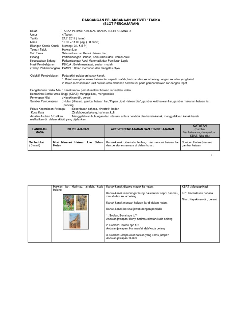 Karno ahli kumpulan. Saya kongsikan di sini contoh rancangan pelaksanaan aktiviti rpa yang boleh digunakan oleh para pendidik pengasuh di taska bagi merancang aktiviti yang menarik untuk kanak kanak. Selamatkan dan kenali haiwan liar bidang. Tema diri saya umur 4 tahun.