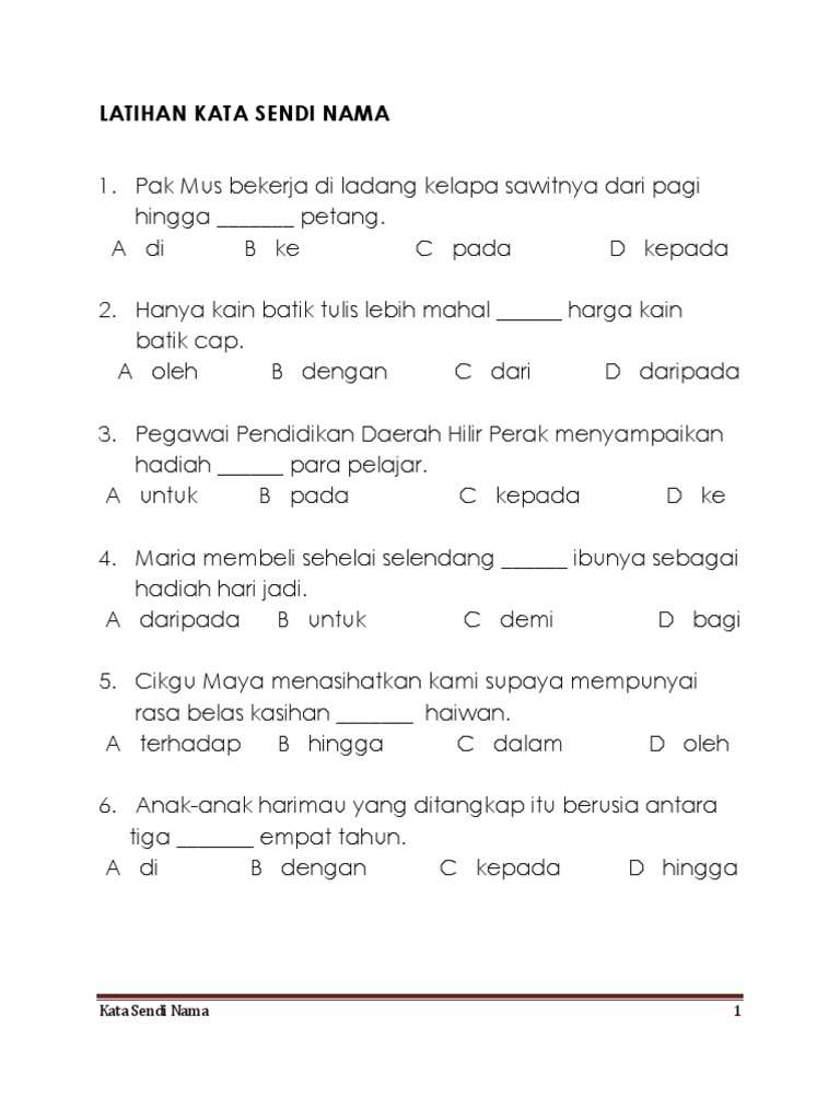 Contoh soalan kata sendi nama. Contoh ayat kata sendi nama 1 contoh ayat kata tanya 1 contoh ayat nilai murni 7 contoh ayat yang menggunakan kata seru 4. A gelas itu terletak pada atas rak. Isi tempat kosong dengan jawapan yang paling sesuai. Latihan kata sendi nama 1.