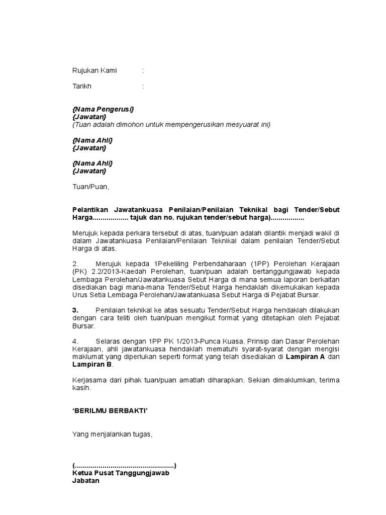 Merujuk kepada 1pekeliling perbendaharaan 1pp perolehan kerajaan pk 2 2 2013 kaedah perolehan tuan puan adalah bertanggungjawab kepada lembaga perolehan jawatankuasa sebut harga di mana semua laporan berkaitan disediakan bagi mana mana tender sebut harga hendaklah dikemukakan kepada urus setia lembaga perolehan jawatankuasa sebut harga di pejabat bursar. Penilaian sebut harga bekalan dan perkhidmatan penilaian sebut harga bekalan perkhidmatan hendaklah dibuat oleh dua 2 jawatankuasa yang berasingan seperti berikut a jawatankuasa penilaian teknikal i keahlian hendaklah tidak kurang daripada tiga 3 orang iaitu seorang pengerusi dan dua 2 orang ahli. Tajuk sebut harga. Dokumen serupa dengan contoh surat pelantikan.