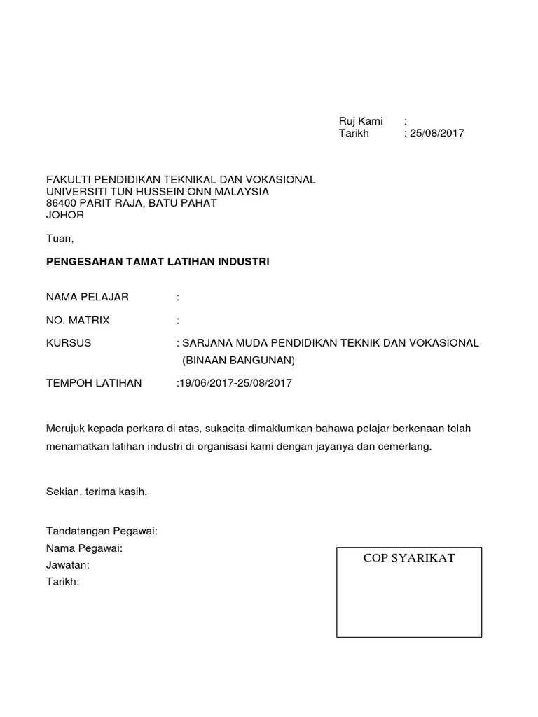 Contoh surat tamat latihan industri. Pegawai perhubungan latihan industri tuan pengesahan tamat latihan industri pelajar kolej komuniti tawau nama pelajar. Penilaian latihan industri 13 7 1 struktur penilaian li 13 7 2 rayuan 13 7 3 keputusan li. Pengesahan lawatan penyeliaan li sesi jun 2012 02. The collection that consisting of chosen picture and the best amongst others.