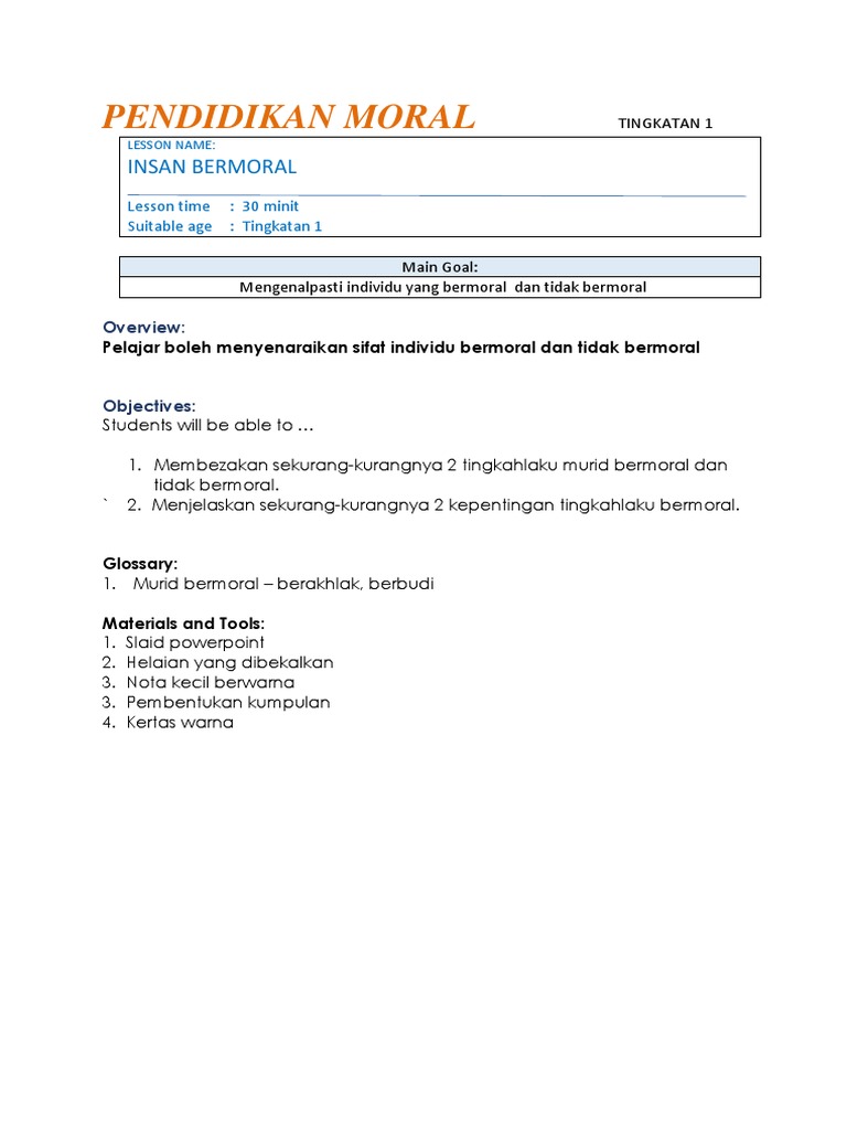 Bapa mendapat pendidikan awal hingga di peringkat sijil pelajaran malaysia sahaja. Bertanggungjawab berdedikasi berprihatinan bekerjasama. Pendidikan moral tingkatan 1 draft. Bermoral jika mempunyai kesadaran untuk menerima dan melakukan peraturan yang berlaku dan bersikap atau mempunyai tingkah laku yang sesuai dengan nilai nilai moral yang dijunjung tinggi di lingkungannya.