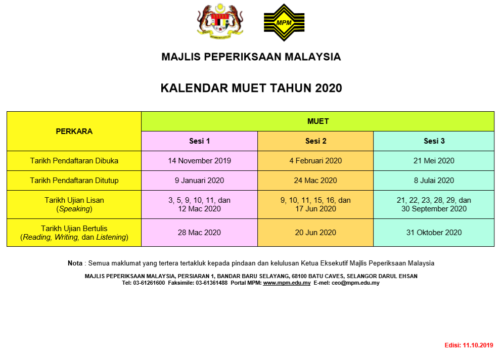Tarikh pendaftaran dan ujian speaking bertulis. Kalendar peperiksaan muet 2019. Peperiksaan muet atau malaysian english university test akan diadakan dalam 3 sesi dalam setahun. Perhatian buat calon yang bercadang untuk menduduki peperiksaan muet sesi 2.