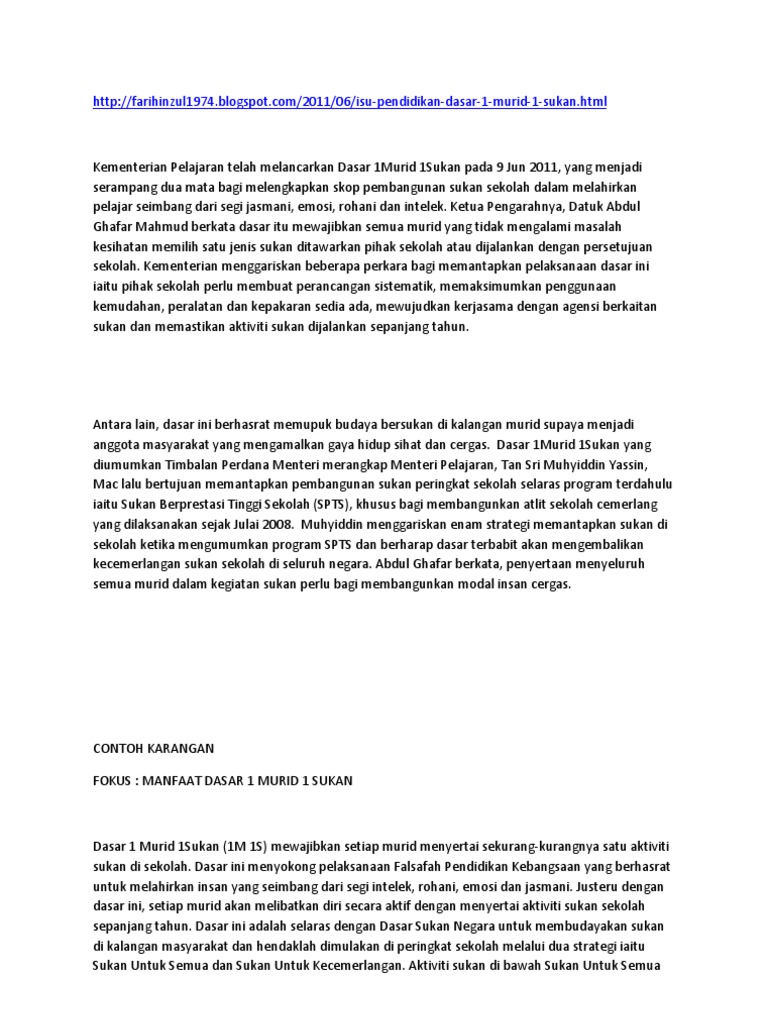 Pekeliling garis panduan pelaksanaan dasar 1 murid 1 sukan di sekolah 23 55 00 1 murid 1 sukan 1m1s modul sukan sukan dasar ini menyokong pelaksanaan falsafah pendidikan kebangsaan yang berhasrat untuk melahirkan insan yang seimbang dari segi intelek rohani emosi dan jasmani. Semoga perkongsian bahan bahan rujukan panduan bahan pembelajaran dan pengajaran contoh contoh karangan sumber rujukan spm sijil pelajaran malaysia tingkatan 4 tingkatan 5 dalam post di blog bumi gemilang berguna dan dapat membantu para pelajar dan pengguna. Faedah dasar 1 murid 1 sukan contoh karangan bm spm sijil pelajaran malaysia. Dasar ini menyokong pelaksanaan falsafah pendidikan kebangsaan yang berhasrat untuk melahirkan insan yang seimbang dari segi intelek rohani emosi dan jasmani.