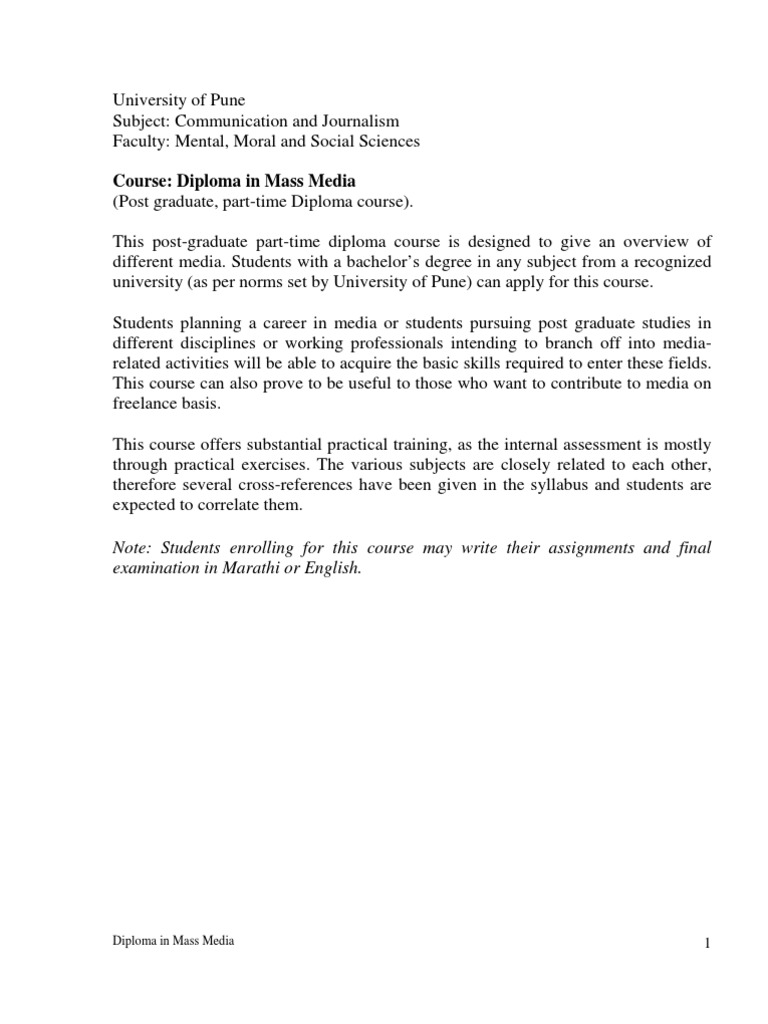Syllabus of mass communication as prescribed by various universities and colleges. The course teaches an honest and progressive journalism to the students and to remove the veil of darkness and ignorance from the society. Diploma in journalism and mass communication. Upon graduating from the diploma in mass communication programme i joined a new company as account manager with better salary prospects.