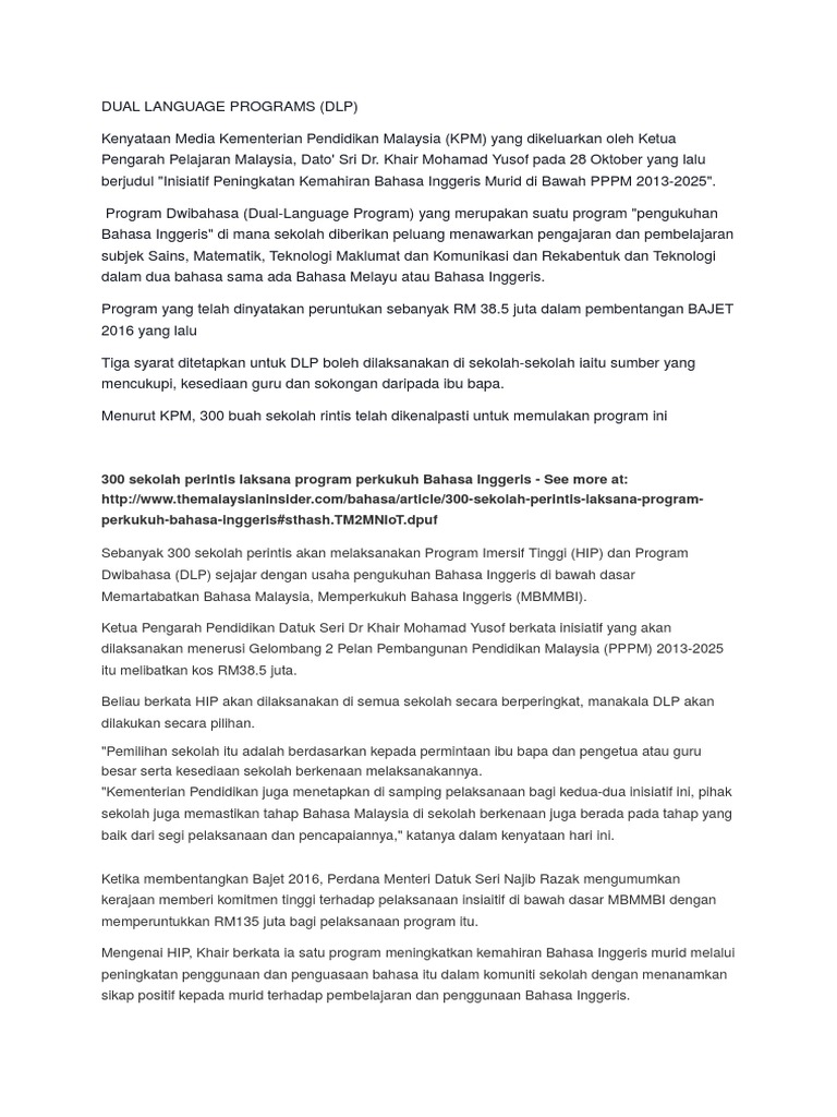 Dlp kementerian pendidikan malaysia 1 0 tujuan garis panduan ini bertujuan untuk memberi penjelasan tentang tatacara pelaksanaan dual language programme dlp di sekolah kerajaan dan sekolah bantuan kerajaan kementerian pendidikan malaysia kpm. Kpm dalam kenyataan berkata ia menjadikan jumlah keseluruhan sekolah yang melaksanakan dlp tahun ini adalah 1 303 sekolah. Program dwibahasa atau dual language programme dlp adalah satu program di bawah dasar memartabatkan bahasa malaysia memperkukuhkan bahasa inggeris mbmmbi. Ia dilaksanakan di sekolah kebangsaan dan sekolah menengah kebangsaan kementerian pendidikan malaysia kpm secara rintis pada tahun 2016 melibatkan 300 buah sekolah.