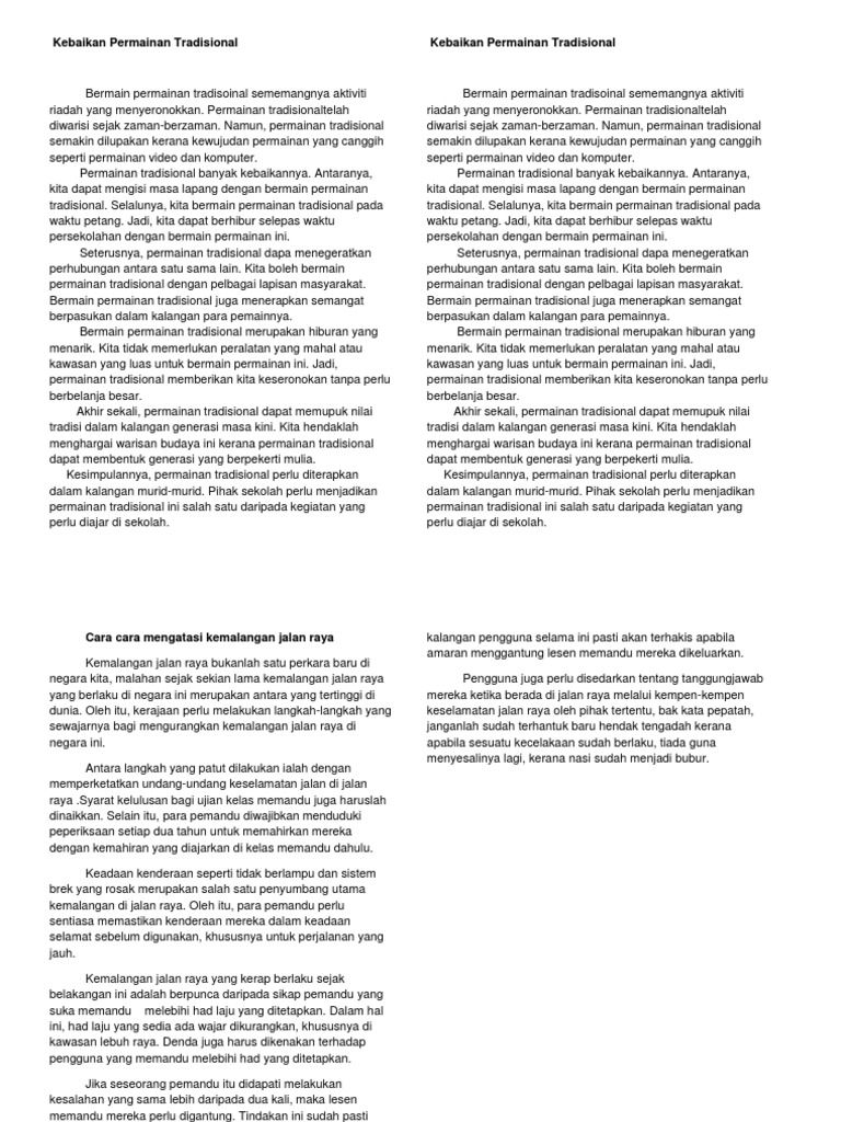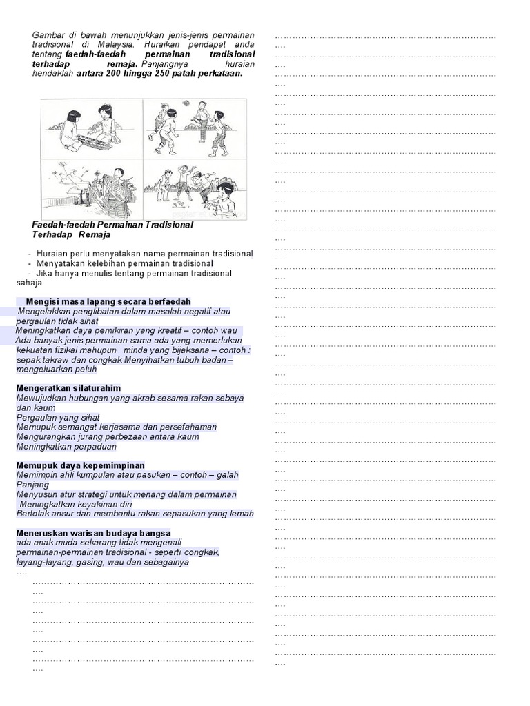 Faedah faedah permainan tradisional terhadap remaja. Ac sebagai contoh permainan congkak yang memerlukan dua orang untuk memainkannya dan begitu juga permainan sepak raga yang perlu dimainkan secara berkumpulan. Ibu bapa juga harus memupuk minat anak anak dalam permainan tradisional ini. Ah mengapa permainan tradisional dapat menghiburkan seseorang kerana permainan ini menyeronokkan dan dimainkan secara berkumpulan. Dengan cara tersebut minat remaja terhadap permainan tradisional dapat dipupuk agar kepelbagaian permainan tradisional dapat dipelihara.