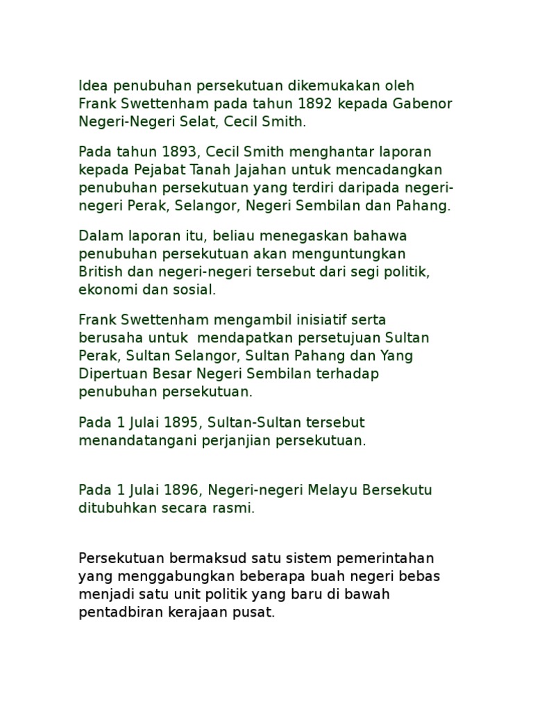 Negeri negeri melayu bersekutu 1896pengenalan idea penubuhan persekutuan dikemukakan oleh frank swettenham pada tahun 1892 kepada gabenor negeri negeri selat cecil smith. Negeri negeri melayu 1. Pendahuluan negeri negeri melayu bersekutu merupakan gabungan 4 buah negeri di tanah melayu iaitu perak negeri sembilan selangor dan pahang yang telah disatukan dalam satu pentadbiran berpusat. Perbelanjaan yang banyak untuk 2.