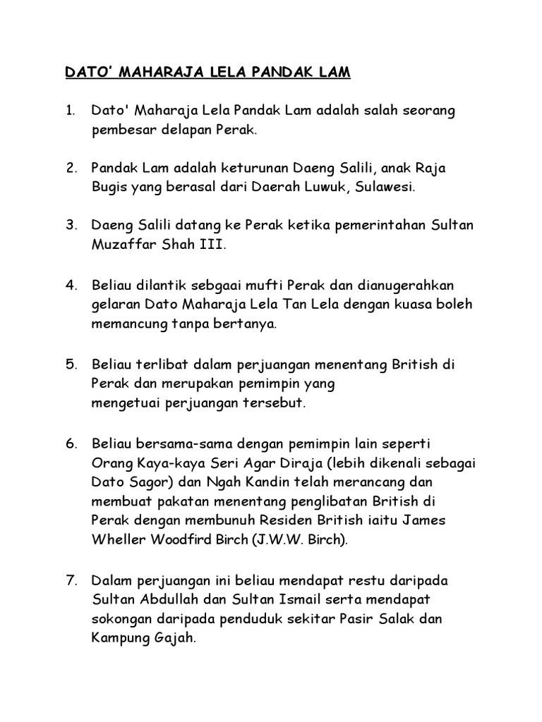 Dato maharaja lela telah di jatuhkan hukuman gantung sampai mati pada 20 januari 1877 kerana merancang pembunuhan tersebut. Dato maharaja lela latar belakang dato maharaja lela pandak lam ialah keturunan daeng salili anak raja bugis yang berasal dari daerah luwuk sulawesi. Dato maharaja lela membina kubu di pasir salak mesyuarat diadakan di durian sebatang antara dato maharaja lela dengan pembesar perak menentang undang undang british. Pada november 1874 perak menerima residen british iaitu j w w birch hasil daripada perjanjian pangkor.