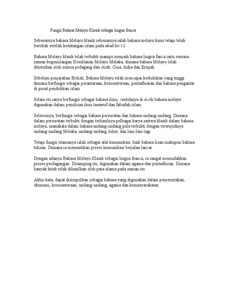 Fungsi bahasa melayu klasik bahasa pentadbiran bahasa persuratan lingua franca bahasa ilmu bahasa undang undang lingua. View fungsi bahasa melayu klasik docx from ba 1222 at ipg kampus bahasa melayu. Fungsi bahasa melayu sebagai bahasa melayu klasik 1. Persuratan kerajaan alam melayu mendapat pengaruh epik dan sastera india yang terkenal seperti ramayana mahabhrata purana dan jataka yang disadurkan ke dalam bahasa tempatan di alam melayu.
