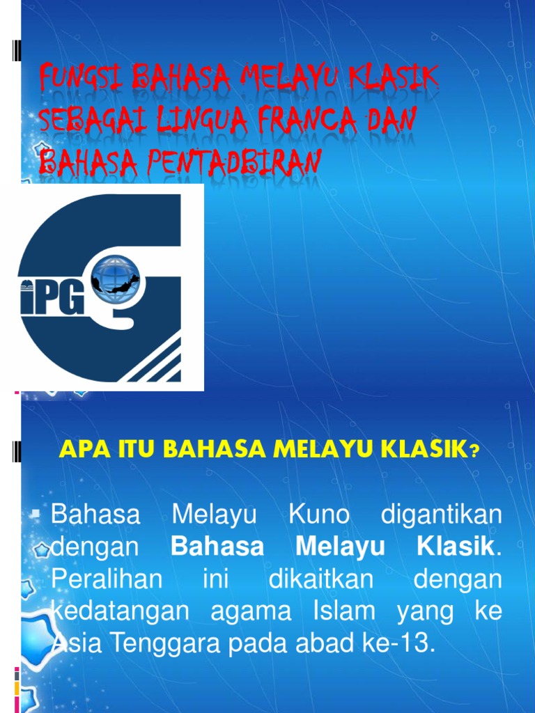 Hal ini dikatakan demikian kerana bahasa melayu klasik bersifat senang difahami dan ditutur oleh orang asing yang disebabkan oleh sistemnya yang mudah dan sesuai untuk. Fungsi bahasa melayu klasik lingua franca bahasa melayu telah digunakan sebagai alat perhubungan utama dalam kalangan masyarakat dan digunakan juga oleh orang yang menggunakan bahasa yang berlainan. Bahasa melayu klasik sebagai lingua franca. Di acheh bahasa melayu digunakan dalam penulisan ilmu tasawuf dan falsafah islam tokoh penulis pada zaman tersebut seperti hamzah fansuri syamsuddin al sumaterani.
