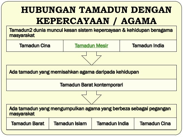 Hubungan antara sistem kepercayaan budaya dan pencapaian ketamadunan. Lazimnya sesuatu bangsa mempunyai pertalian yang rapat dengan sejarah tradisi dan budaya kawasan geografi tertentu. Memahami hubungan tamadun dengan agama budaya dan bangsa 3. Berbicara tentang agama keperercayaan dan begitu pula sebaliknya terkadang sulit untuk membedakan mana agama dan mana kepercayaan. 1 2 hubungan tamadun dengan agama budaya dan bangsa hubungan tamadun dengan agama tamadun dan agama mempunyai pertalian yang rapat dan kebanyakan tamadun berteraskan agama.