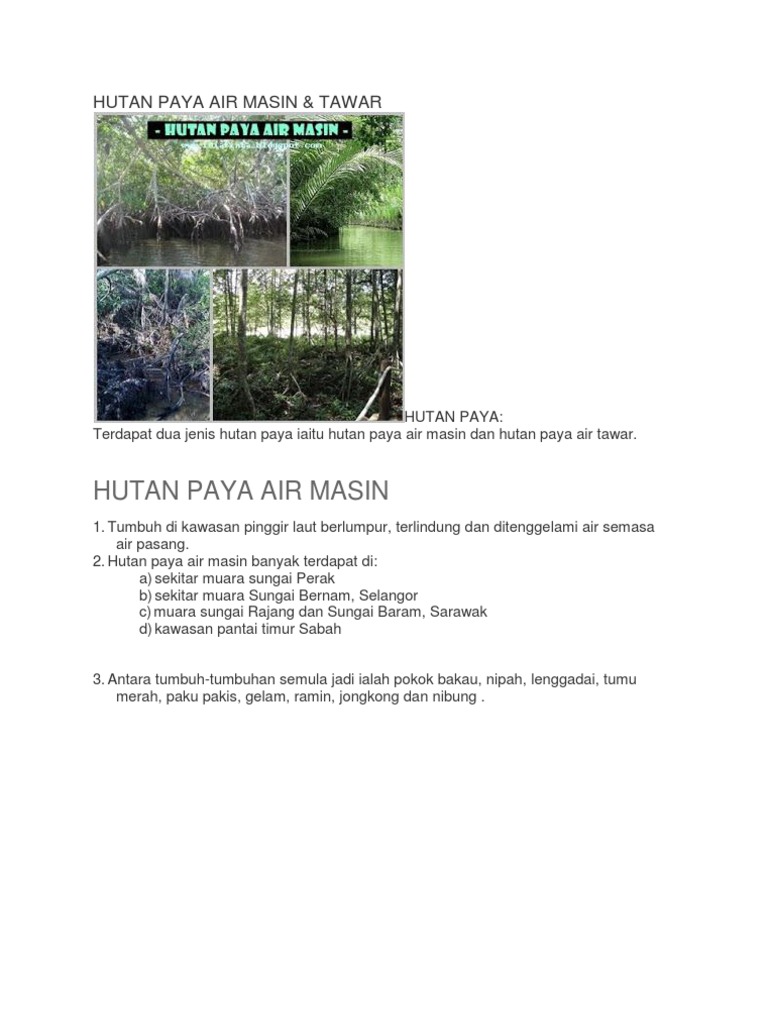 Hutan paya air tawar terdapat di kawasan pedalaman yang bersaliran buruk. Hutan paya air tawar terdapat di kawasan pedalaman yang bersaliran buruk kawasan ini juga selalu ditenggelami air khususnya sungai dan tasik pokok pokok tumbuh di atas tanih aluvium tanih gambut dan tanah liat. C sebahagian sabak bernam selangor. Dikelilingi hutan dipterokarp tanah rendah yang kering persekitaran tasik ini adalah kawasan kawasan hutan paya gambut.