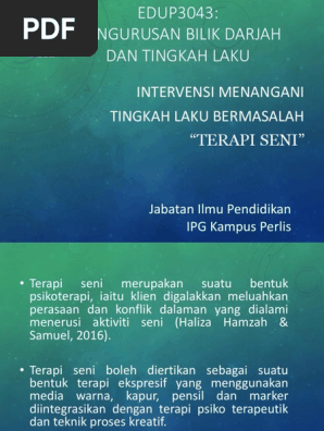 Satu bentuk terapi emosi dan tingkah laku. View terapi muzik pptx from aa 1menangani tingkah laku bermasalah terapi muzik terapi seni by. Intervensi menangani tingkah laku bermasalah. Klien digalakkan untuk meluahkan perasaan dan konflik melalui aktiviti seni.