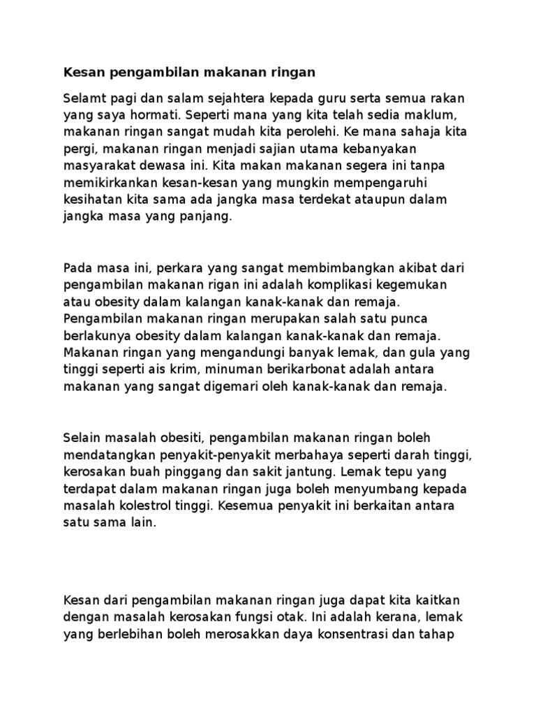Karangan kesan pengambilan makanan segera. Ancaman tersebut ialah radang paru paru yang boleh membawa kepada penyakit asma yang kronik. Jika dijadikan hidangan yang dinikmati sekali sekala makanan itu kurang memudaratkan. Berilah makanan yang segar katanya dalam post itu. Kesibukan dalam tugas seharian dalam kehidupan telah mendorong masyarakat pada hari ini untuk mencari jalan pintas dengan mengambil makanan segera sebagai alternatif daripada makanan berat.