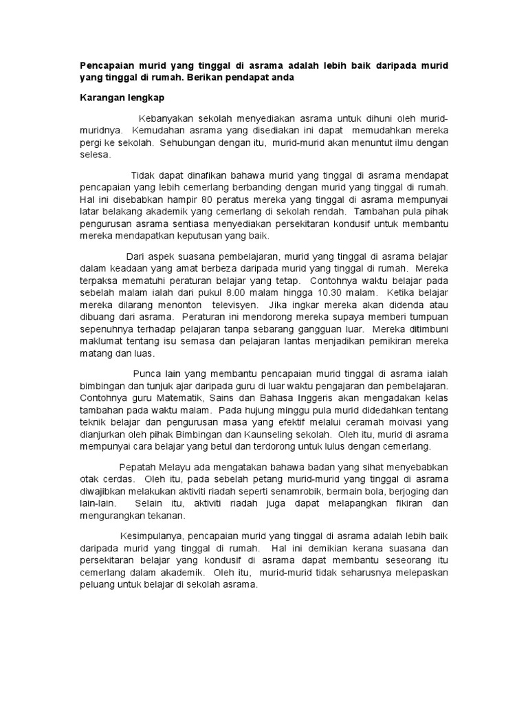 Kebaikan tinggal di asrama sekolah karangan spm. Pelajar juga mempunyai masa lebih kerana tidak terganggu dengan masa pergi dan balik sekolah setiap hari seperti pelajar sekolah harian. Kebaikan tinggal di sekolah asrama. Lebih masa untuk belajar di sekolah asrama terdapat waktu yang telah dikhaskan untuk belajar di waktu petang dan malam. Cuma makan je pihak asrama akan sediakan itu pun makan dalam tray.