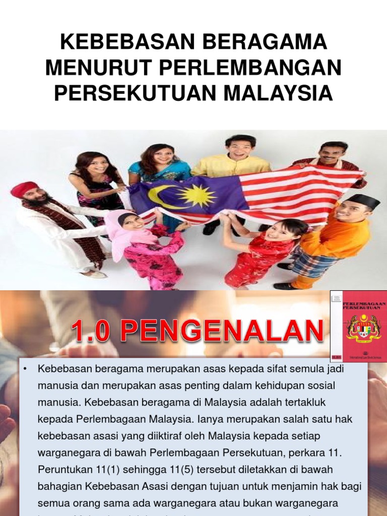 Kebebasan beragama merupakan satu konsep perundangan yang berkaitan tetapi tidak serupa dengan toleransi agama pemisahan di antara agama dan negara atau negara sekular. Perkara mengenai kebebasan diri telah diperuntukan dalam fasal 1 perkara 5 perlembagaan persekutuan yang memperuntukkan tidak seorang pun boleh diambil nyawanya dan dilucutkan kebebasan dirinya kecuali menurut undang undang. Salah satu kebebasan asasi adalah kebebasan bercakap berhimpun dan berpersatuan yang terkandung di dalam perkara 10 perlembagaan persekutuan. 4 kebebasan beragama yang terkandung dalam perlembagaan malaysia agama islam ialah agama rasmi bagi persekutuan tetapi tiap tiap orang berhak menganuti dan mengamalkan agamanya sendiri 5 amalan umum yang terdapat di semua tempat beribadat.
