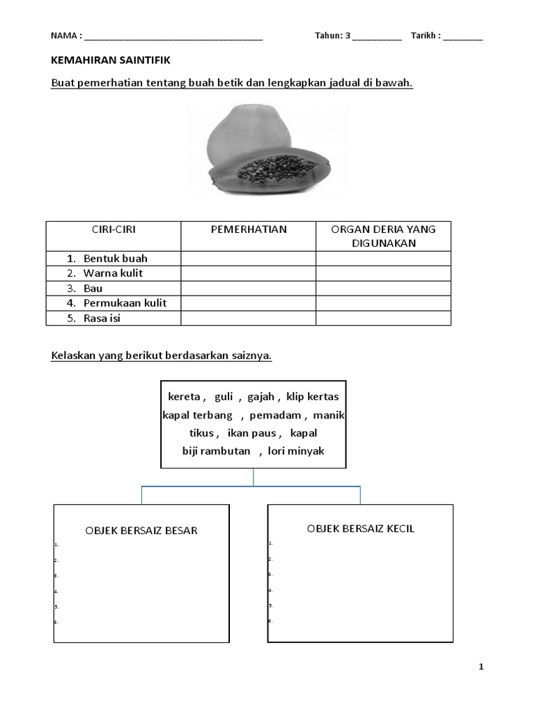Sijil penyertaan akan diberikan kepada murid yang berjaya menjawab betul 70 markah dan ke atas. Ketika melakukan proses memerhati kita menggunakan deria penglihatan pendengaran sentuh rasa atau bau untuk mengumpulkan maklumat tentang objek dan fenomena. Sumber daripada pelbagai buku rujukan dengan pengubahsuaian. 1 kemahiran saintifik buat pemerhatian tentang buah betik dan lengkapkan jadualdi bawah.