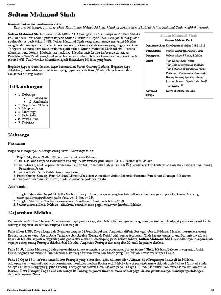 Sultan mahmud shah سلطان محمود شاه memerintah 1488 1511 mangkat 1528 merupakan sultan melaka ke 8 dan terakhir adalah putera kepada sultan alauddin riayat shah selepas kemangkatan ayahandanya pada tahun 1488 sultan mahmud shah yang masih muda mewarisi melaka yang telah mencapai kemuncak kuasa dan merupakan pusat dagangan yang unggul di asia tenggara. Katanya sultan melaka tidak lagi wujud setelah portugis menawan kota melaka pada 10 ogos. Pengerusi persatuan sejarah malaysia cawangan melaka psmcm prof datuk dr mohd jamil mohd mukmin berkata sejak itu melaka tiada lagi sultan. Hang kamu merujuk kepada noor jan orang perak nak tuntut melaka sedangkan sultan sultan sebelum ini tidak pun berbuat begitu.