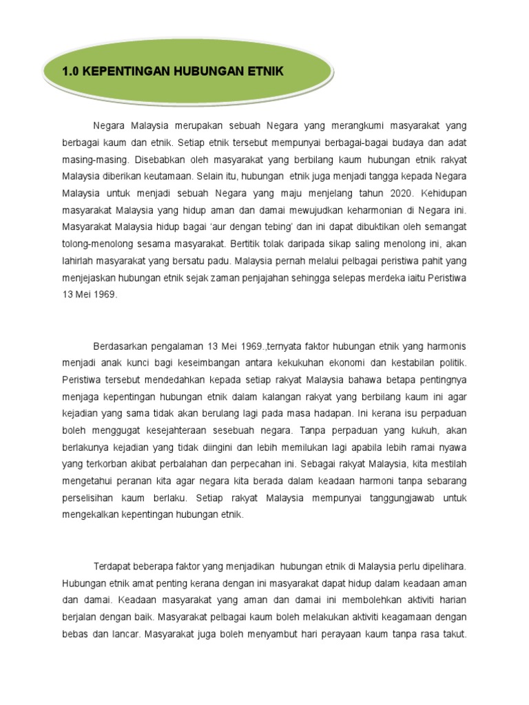Kepentingan hubungan etnik di malaysia. Kepentingan memahami dan menjaga hubungan etnik di negara draft. Pendahuluan kepentingan hubungan etnik di malaysia dalam membentuk perpaduan dalam menongkah era globalisasi yang kian meningkat dari semasa ke semasa tanah air kita hampir mencapai kecemerlangan selaras dengan negara maju yang lain bak kata peribahasa melayu duduk sama rendah. Perkembangan etnik membawa impak positif dan negatif kepada negara dan kehidupan bermasyarakat. Pembangunan ekonomi dalam konteks hubungan etnik di malaysia.