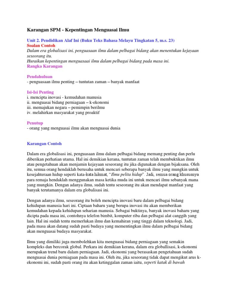 Bandar pintar malaysia bandar dalam taman putrajaya mercu tanda kemajuan negara perpaduan menjamin keamanan unit 5. Karangan spm 7 peranan ibu bapa dalam pembentuka. Rangka karangan pendahuluan penguasaan ilmu penting tuntutan zaman banyak manfaat isi isi penting i. Karangan kepentingan menguasai ilmu dalam era globalisasi penguasaan ilmu dalam pelbagai bidang memang penting dan perlu diberikan perhatian utama.
