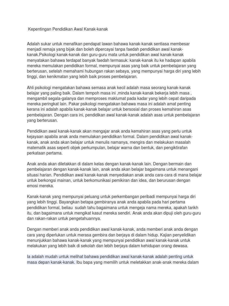 Kepentingan pendidikan awal kanak kanak di malaysia. Oleh itu pendidikan awal merupakan. Stem di peringkat awal kanak kanak di malaysia. Konsep pendidikan awal kanak kanak di malaysia adalah mengikut dua peringkat berdasarkan tahap umur kanak kanak. Pendidikan awal kanak kanak formal di malaysia mula berkembang pada tahun 1950 an iaitu selepas perang dunia ke dua.