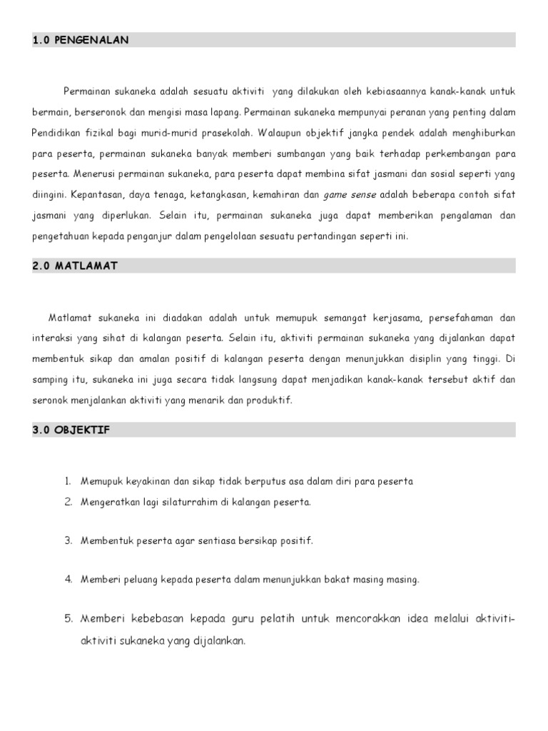 Kertas kerja hari sukan negara peringkat sekolah kertas kerja perkhemahan ub. Melalui kegiatan sukan murid murid bukan sahaja dapat mencapai kecemerlangan dalam bidang ini malah juga dalam pengalaman lain seperti sosial kepimpinan serta dapat mendisiplinkan diri. Contoh kertas kerja sukaneka prasekolah contoh kertas kerja program contoh kertas kerja perniagaan contoh kertas kerja hari keluarga contoh kertas kerja pinjaman contoh kertas kerja program contoh kertas cadangan contoh kertas kerja lawatan contoh kertas kerja program motivasi contoh kertas kerja hari keluarga. Permainan sukaneka mempunyai peranan yang penting dalam pendidikan fizikal bagi murid murid prasekolah seperti pusat asuhan tunas tunas islam pasti ini.