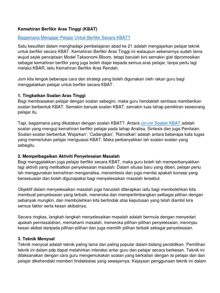 Kbat pula adalah kemahiran pada aras lebih tinggi yang melibatkan keupayaan menganalisis maklumat membuat penilaian terhadap maklumat tersebut serta berupaya mencipta sesuatu berinovasi membuat keputusan dan penyelesaian masalah. Kemahiran berfikir aras rendah kbar kemahiran berfikir aras tinggi kbat lower order thinking lot is often characterized by the recall of information or the application of concepts or knowledge to familiar situations and contexts. Peringkat kedua kemahiran berfikir aras. Penekanan dalam kurikulum dan pedagogi.
