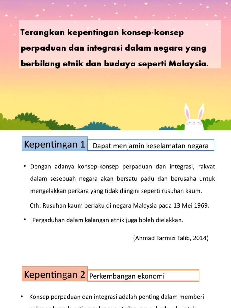 Konsep perpaduan dan integrasi kaum di malaysia. Sosial pendidikan dan politik. Integrasi dan perpaduan kaum memainkan peranan yang sangat besar dalam memajukan negara. Menurut titah sultan johor sultan ibrahim ibni almarhum sultan iskandar s emangat perpaduan perlu dipupuk di dalam setiap rakyat malaysia dari bangku sekolah lagi seiring dengan mengukuhkan semangat jati diri di samping memberi keutamaan kepada mata pelajaran sejarah dan menjadikan sistem pendidikan sebagai medium mustahak untuk mengkekalkan perpaduan kaum. Ringkasnya perpaduan dan integrasi nasional adalah matlamat asas baginagara malaysia.