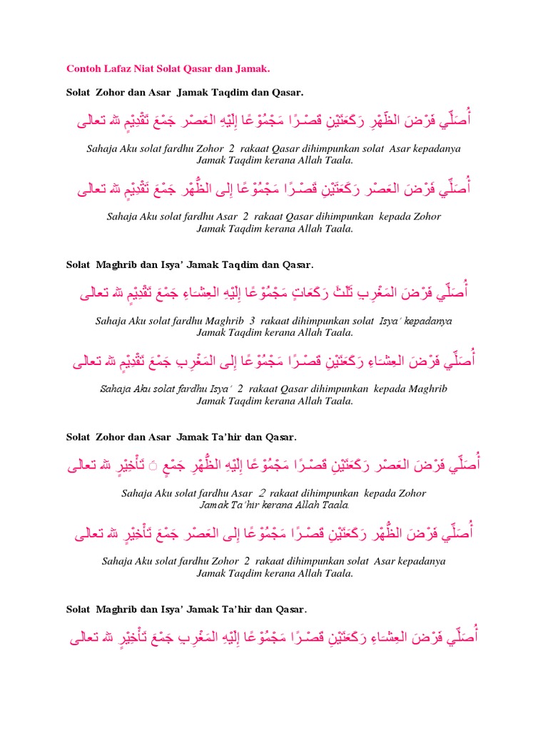 Solat yang boleh dipendekkan menjadi dua rakaat ialah solat isyak zohor dan asar. Simak ulasan tentang sholat bagi musafir sholat qashar niat sholat qashar sholat jamak dan niat sholat jamak pada artikel ini. Niat solat jamak dan qasar serta cara melaksanakannya. Solat ini terbahagi kepada dua iaitu jamak takdim dan jamak takhir.