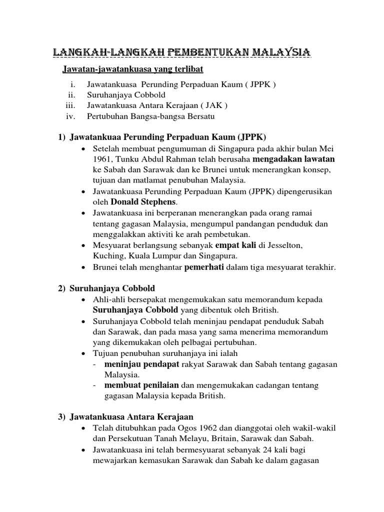 Langkah langkah pembentukan malaysia 1963. Langkah langkah pembentukan malaysia lawatan tunku abdul rahman ke sarawak dan sabah serta brunei untuk menerangkan konsep tujuan dan matlamat penubuhan malaysia mengadakan rundingan antara pegawai pegawai kanan persekutuan tanah melayu dengan pegawai pegawai british dari sarawak sabah dan singapura. Oleh itu jawatankuasa tersebut mengambil langkah mengumpul dan membandingkan idea idea berkaitan dengan struktur pembentukan malaysia yang dikumpul. Langkah langkah diambil bagi meninjau pendapat dan kehendak rakyat terhadap gagasan malaysia. Nor azlina abdul aziz 5 zamrud langkah langkah pembentukan malaysia suruhanjaya cobbold suruhanjaya cobbold jawatankuasa antara kerajaan jawatankuasa perunding perpaduan kaum suruhanjaya ini juga mengemukakan beberapa cadangan iaitu perlembagaan malaysia baharu berasaskan.