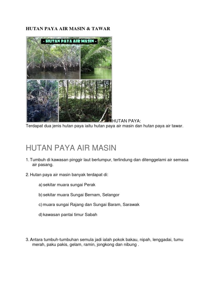 Lapisan hutan paya air tawar. Hutan paya air tawar terdapat di kawasan pedalaman yang bersaliran buruk kawasan ini juga selalu ditenggelami air khususnya sungai dan tasik pokok pokok tumbuh di atas tanih aluvium tanih gambut dan tanah liat. Kawasan hutan pay air tawar ialah. 2 hutan paya air masin paya bakau hutan paya air tawar. Hutan rawa bakau mangrove forest adalah kawasan hutan yang tumbuh berkembang di wilayah air payau sehingga tumbuhan yang hidup disini dipengaruhi oleh pasang surutnya air laut.